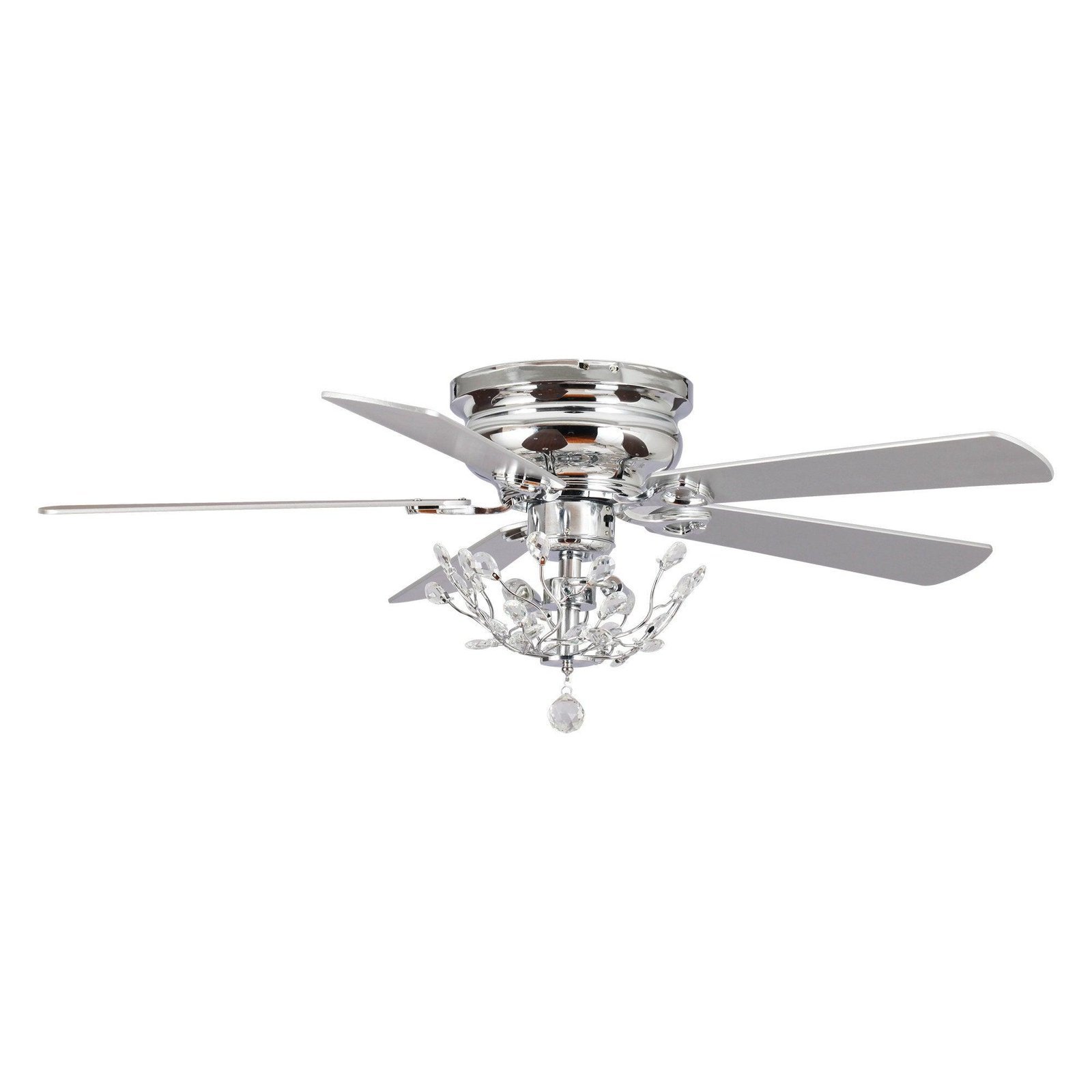 This Parrot Uncle 48 in. chrome ceiling fan has a swanky style, featuring a 2-light kit embellished with clear crystals, just like a beautiful tree that is full of crystal buds. A 3-Speed reversible AC motor with 5 fan blades in silver and dark cherry 2-colors provides plenty of airflow, powerful but quiet. Flush mount design to provide high functionality for most interior living spaces, perfect for all living areas, especially the bedroom.