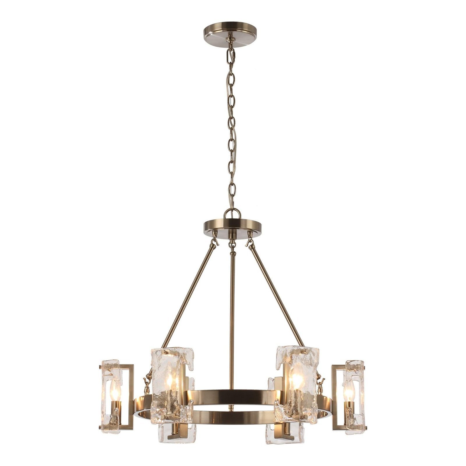 Turn on this wheel candle chandelier to make your home bright and cozy. The smooth, clean lines of the metal frame add style while the seeded glass provides soft light for interior spaces. This light adds a modern style to your home with its brushed metal look. Chandeliers are famed for their ability to elevate a space with their many lights and elaborate fixtures. This chandelier is the perfect pick for modern farmhouse arrangements.