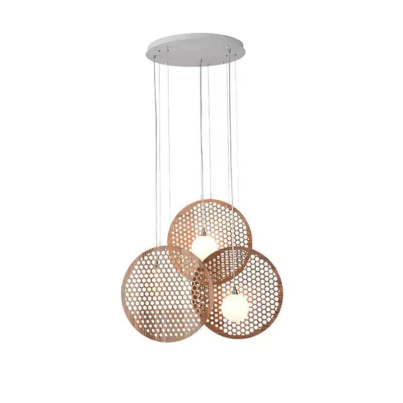 The Bee Plate Chandelier is a unique and artistic lighting fixture that perfectly blends geometric patterns with natural warmth. Inspired by the intricate structure of a beehive, this chandelier features large circular wooden plates that are perforated to allow light to filter through in fascinating patterns. Acrylic spheres behind these plates emit a soft, ambient glow, creating a stunning interplay of light and shadow.